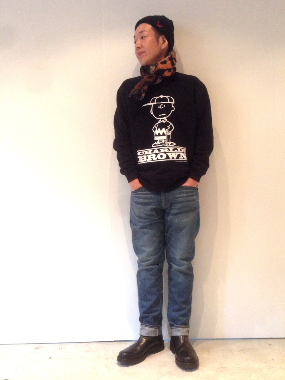 LUMP limited チャーリブラウンスウェット 仙台カラー ビーニー×ストール×スウェット×デニムパンツ×ブーツ