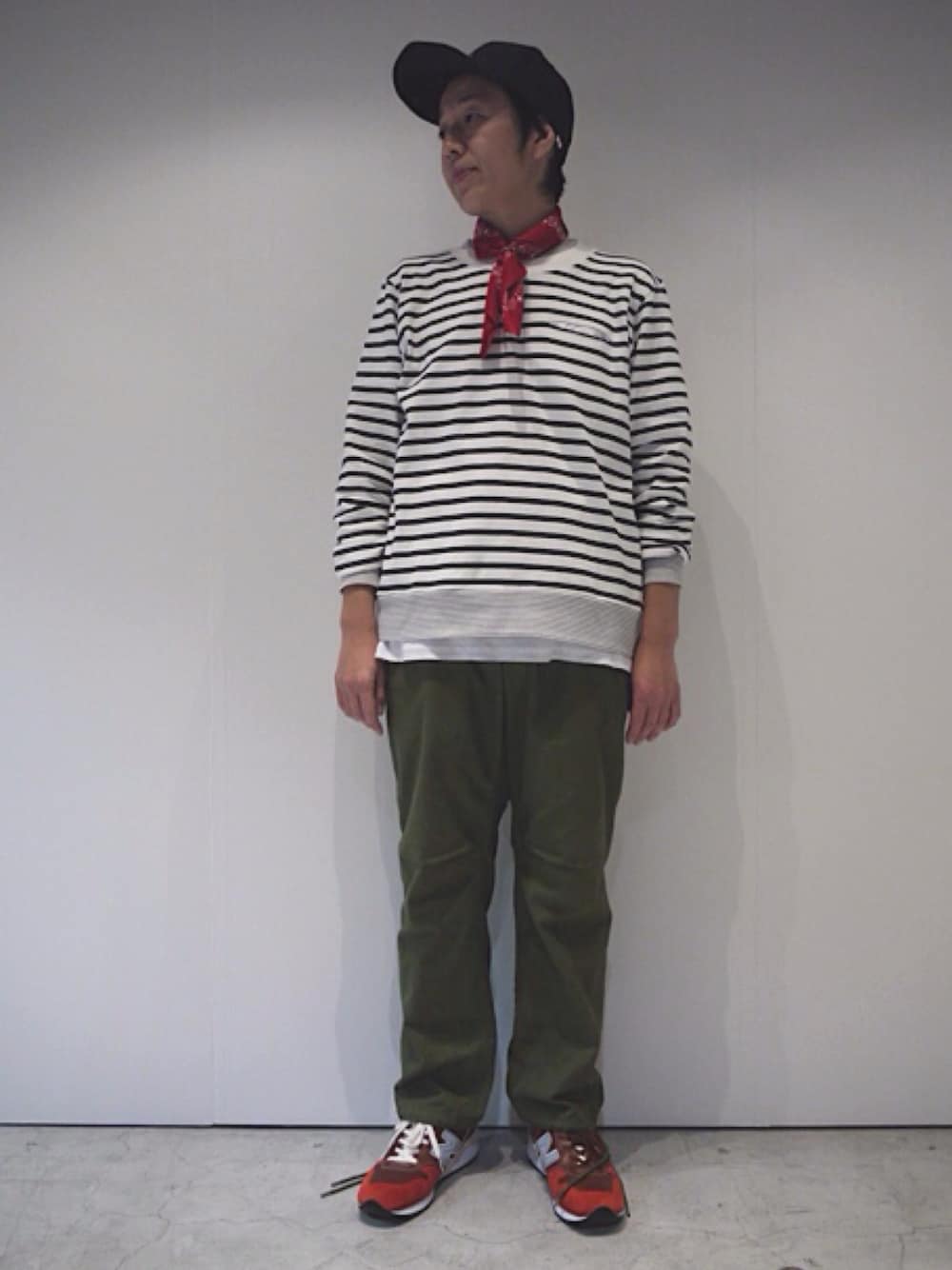 バンダナ使い キャップ×ボーダー×ミリタリーパンツ×スニーカー