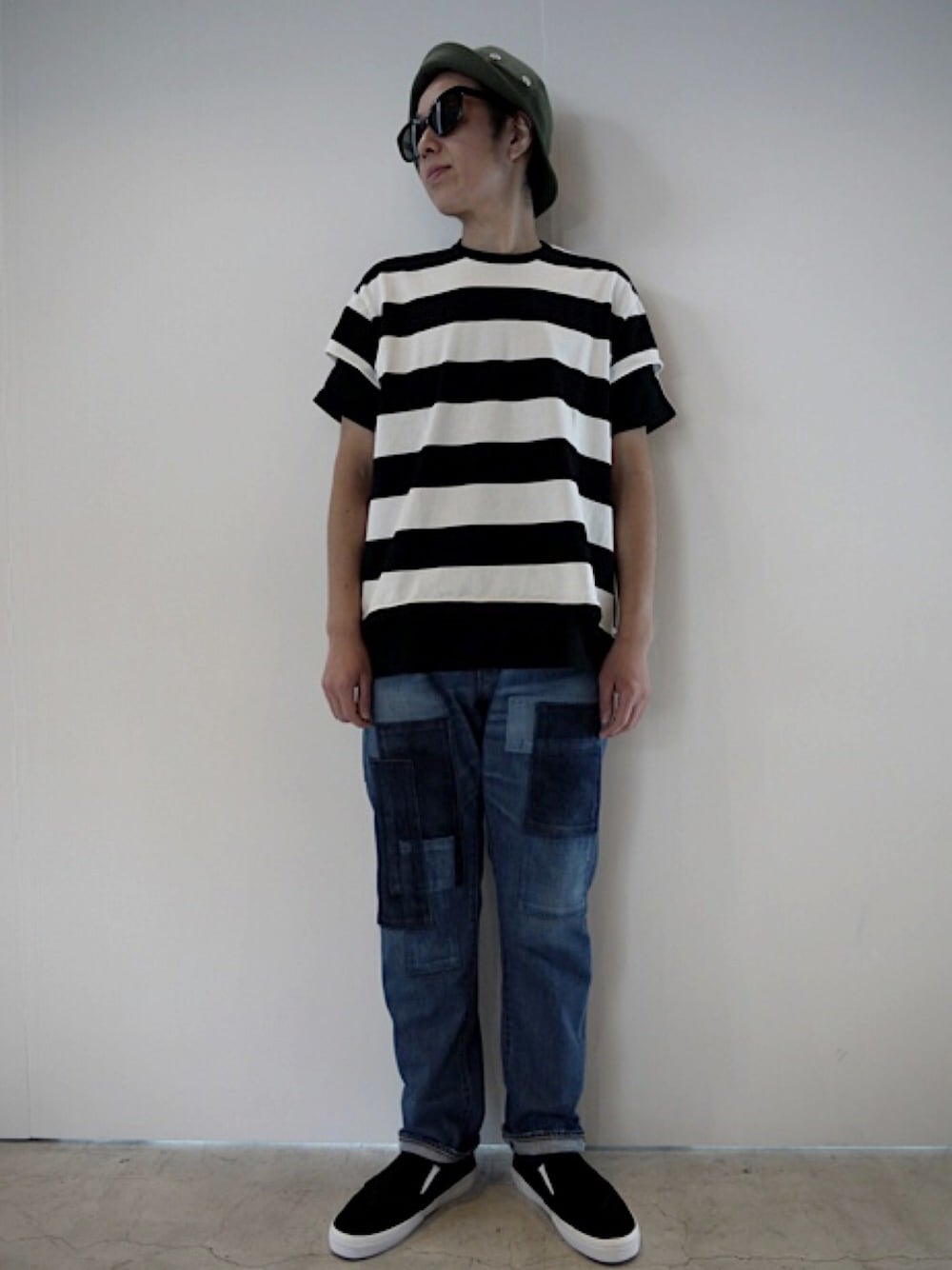 懐かしい感じの太ボーダーT ハット×サングラス×ボーダーT×パッチワークデニム×スリッポン