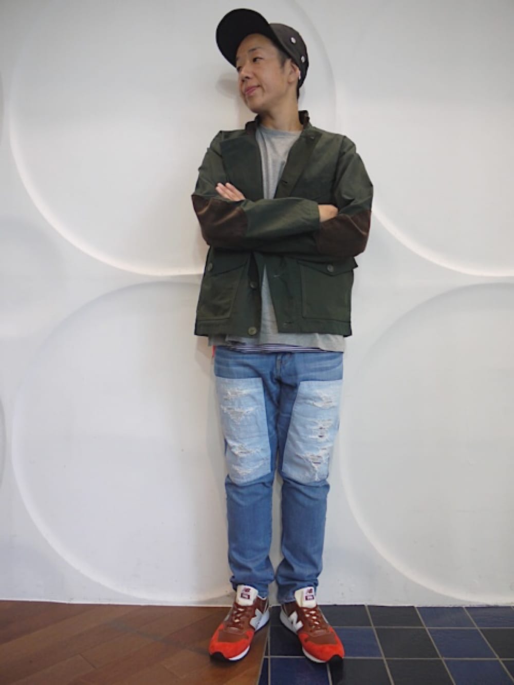 キャップ×オリーブジャケット×カットソー×加工デニムパンツ×スニーカー