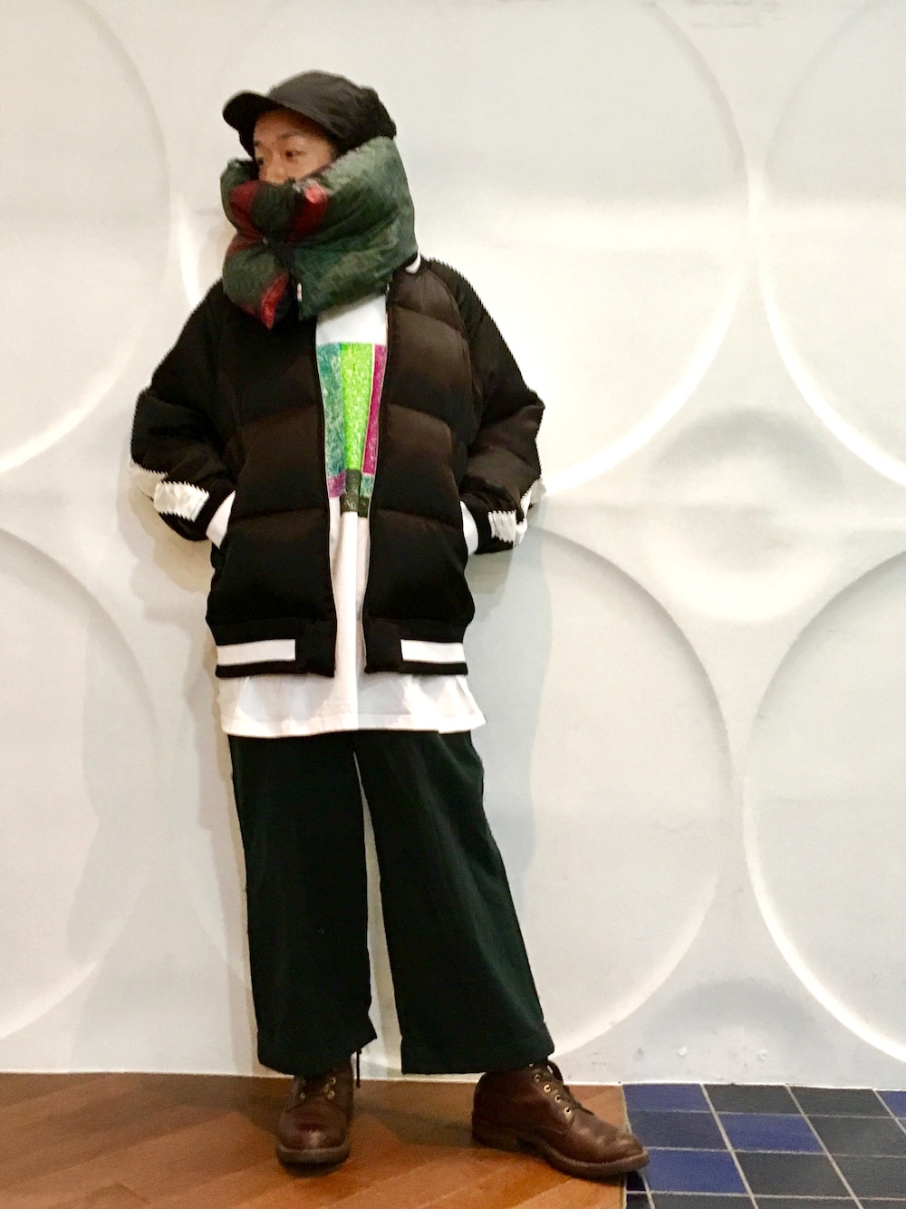 ダウンスタイル ボアキャップ×スカダウン×ダウンマフラー×ビッグT×太パン×ブーツ