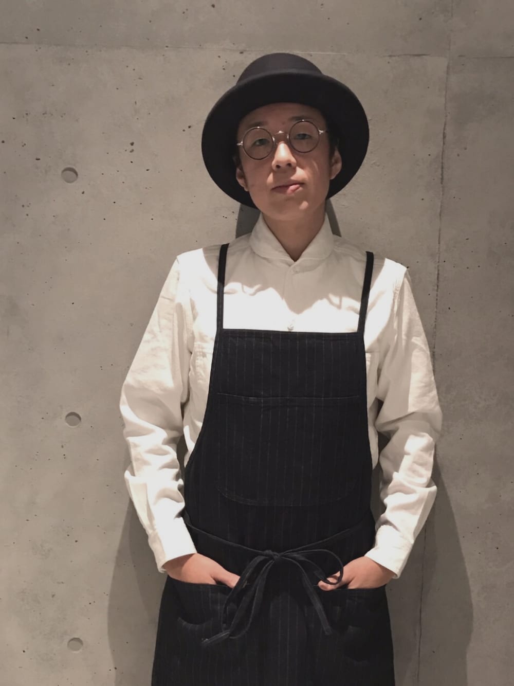 男子厨房に入るべし! ボーラーハット×丸メガネ×ショールカラー×デニムエプロン