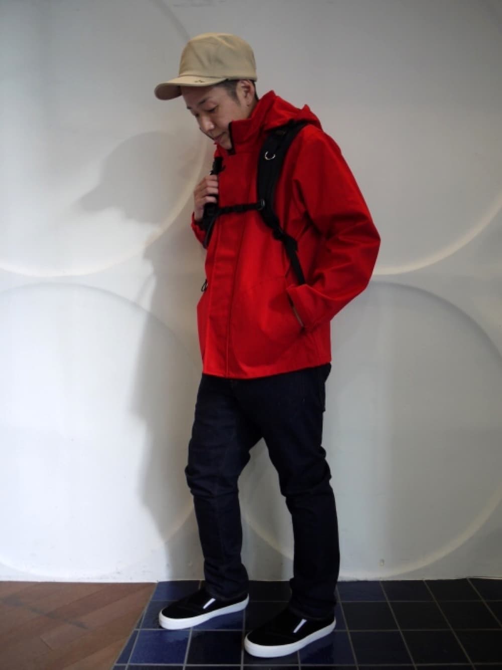 まだまだ寒い春スタイル JETキャップ×実は背負っていない赤いアウター×デニム×黒いスリッポン