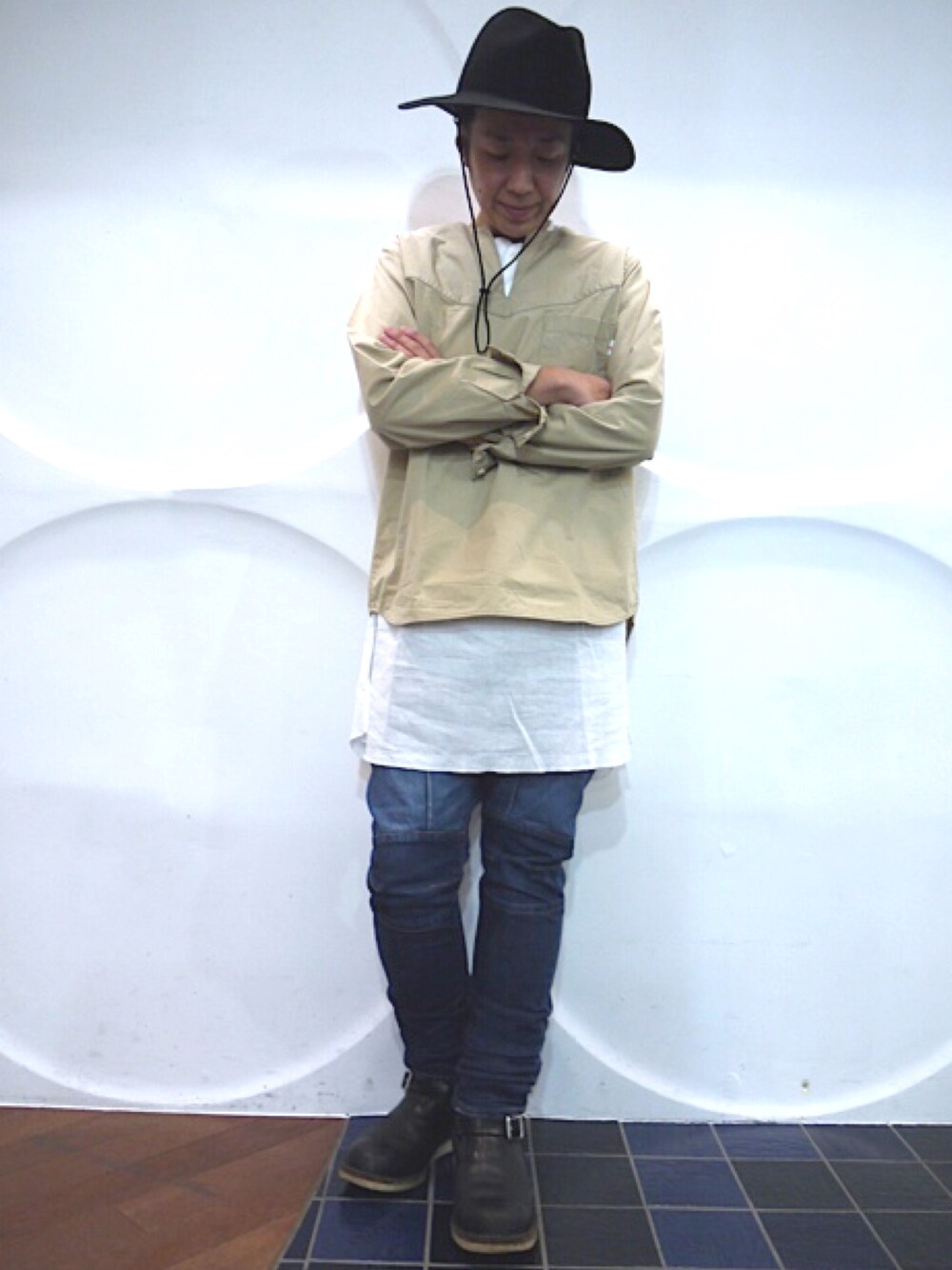 ノーカラー×オープンフロントの襟ナシレイヤード ハット×オープンフロントシャツ×ノーカラーロングシャツ×バイカーデニム×エンジニアブーツ