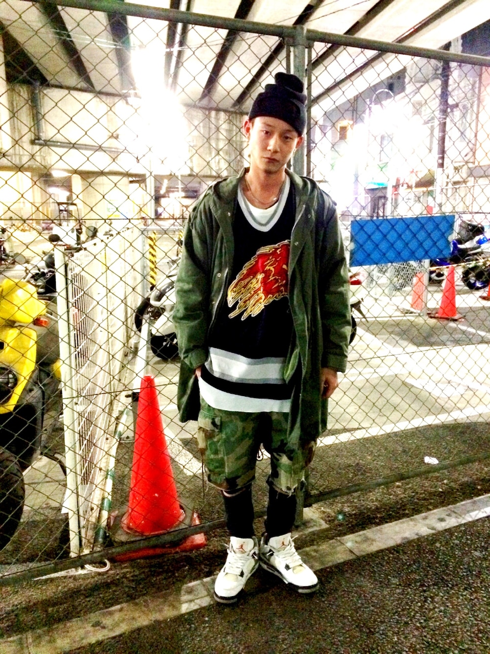 CAP/ORIGINAL CUSTOM KNIT CAP OUTER/USED US M-51 INNER/VINTAGE"METALLICA"HOCKEY JERSEY SHORTS/USED CAMO SHORTS SWEAT PANTS/ORIGINAL CUSTOM SHOES/AIR JORDAN 4