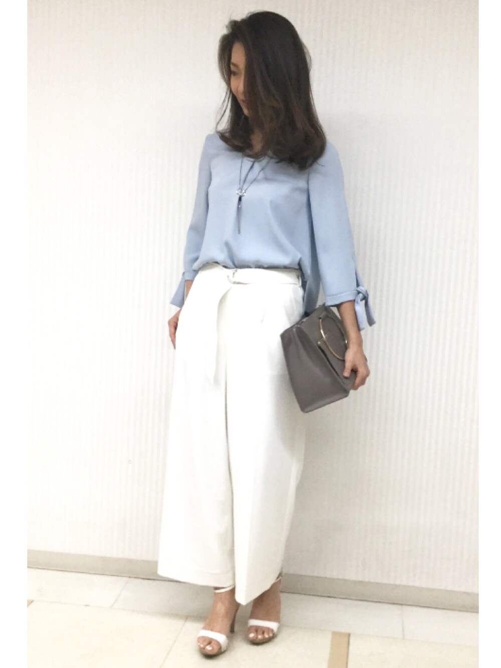 ライトブルーにホワイトの爽やかコーデ。お袖のリボンがポイント。