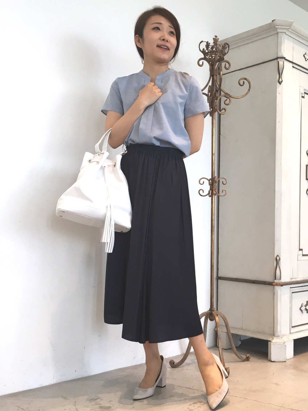 休日のお出かけコーデ。半袖シャツをミモレ丈スカートと合わせて大人っぽく。