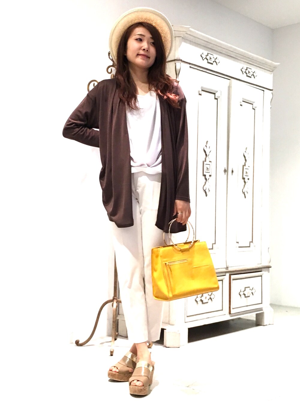 この時期冷房対策の羽織りはマスト。ブラウンのカラーで今年らしく。