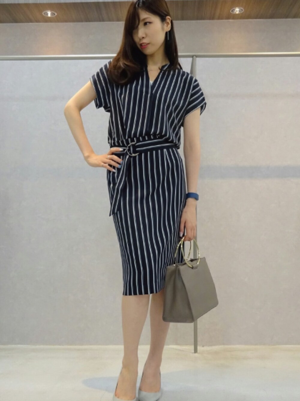 マルチストライプのセットアップでオフィスでも映えるカッコいい女子を演出。
