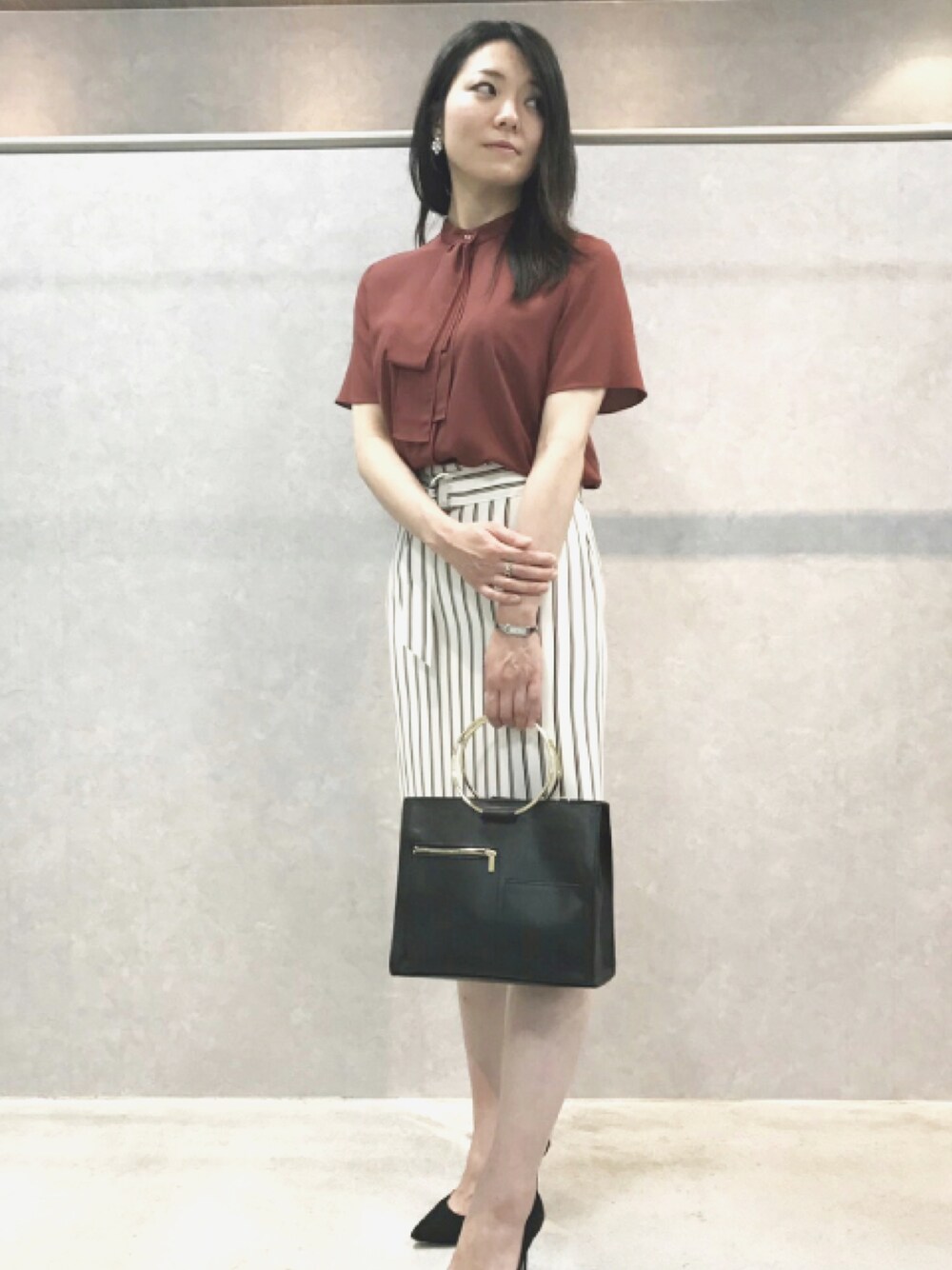 秋のトレンド、クラシックなスタイルを先取り!ボウタイブラウスにストライプのタイトスカートをあわせてお仕事スタイル。