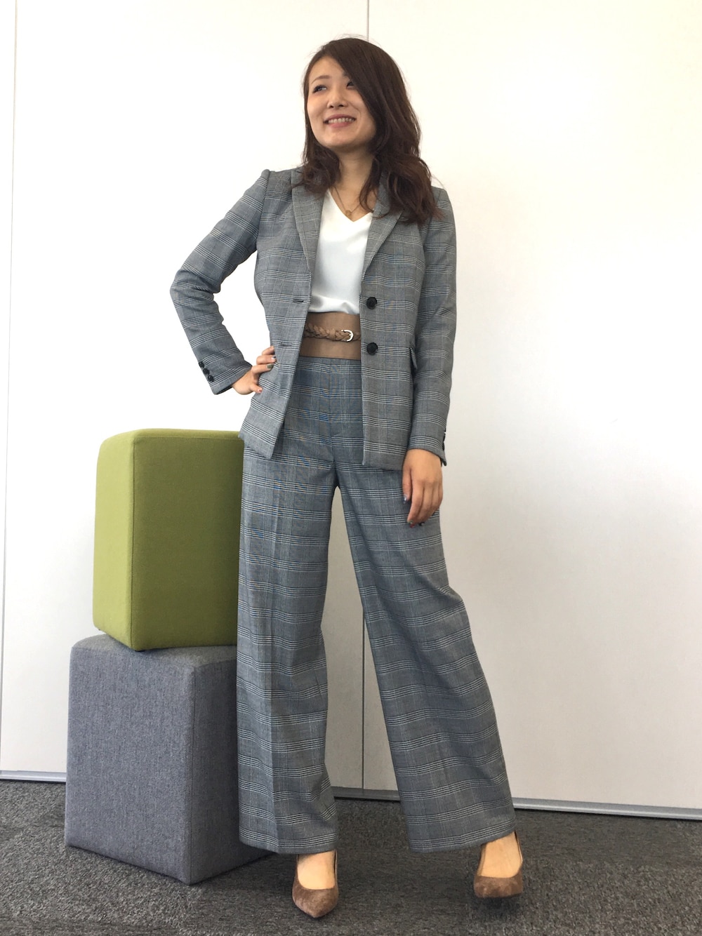 グレンチェックのセットアップでトレンドど真ん中のマニッシュコーデ。サッシュベルトでアクセント。