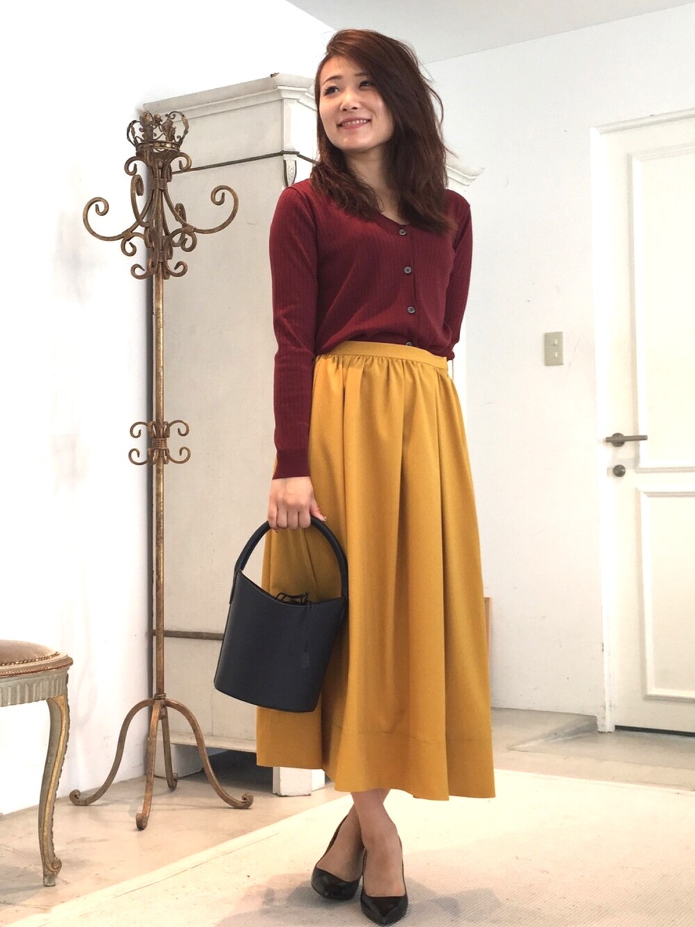 秋カラーのマスタードイエローをテラコッタの目をひくカラーコーデ。リブカーディガンをプルオーバーできるのがポイント!