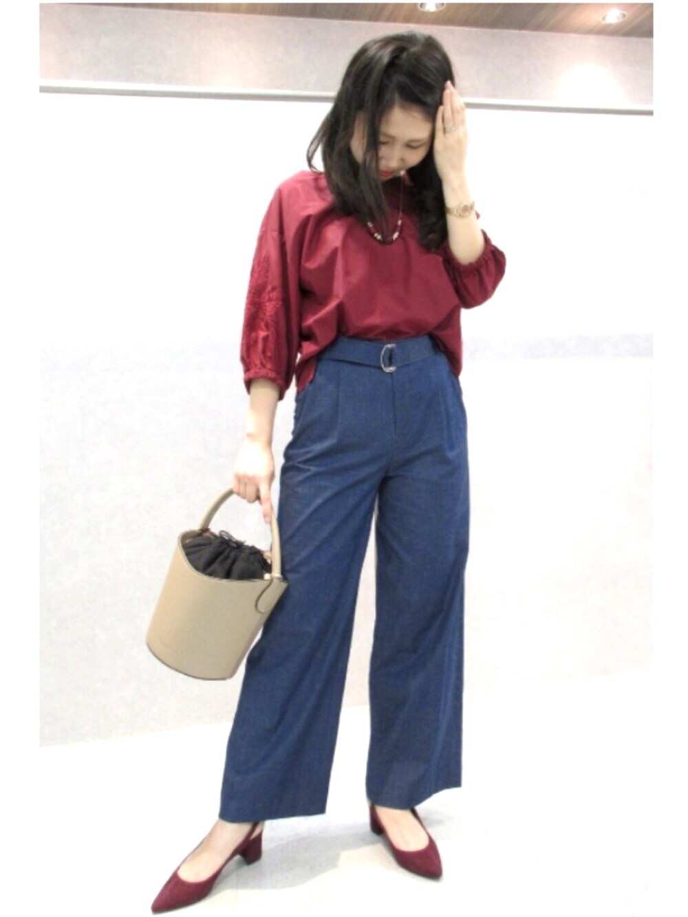 トレンドの刺繍トップスは同色刺繍のものなら、悪目立ちせず子供っぽくならない。 上品なボルドーカラーをワイドデニムと合わせた大人カジュアルスタイルで休日気分を盛り上げて!