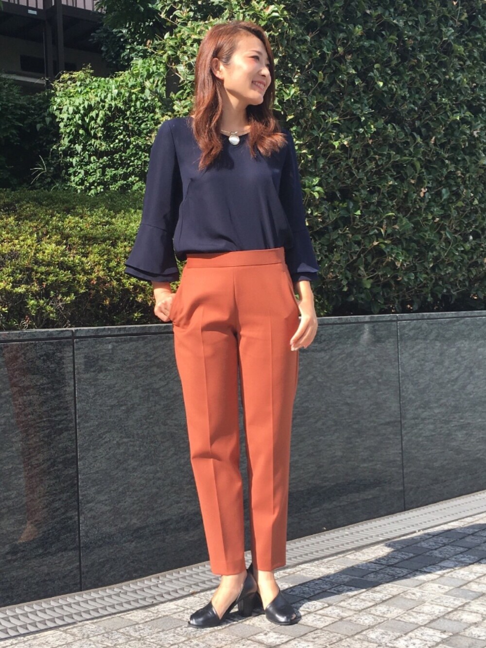 大人気のフレアスリーブのブラウスにボトムスはテーパードシルエッットのパンツを合わせてきれいめコーデ に。 今季旬なテラコッタカラーで合わせてより秋らしく。