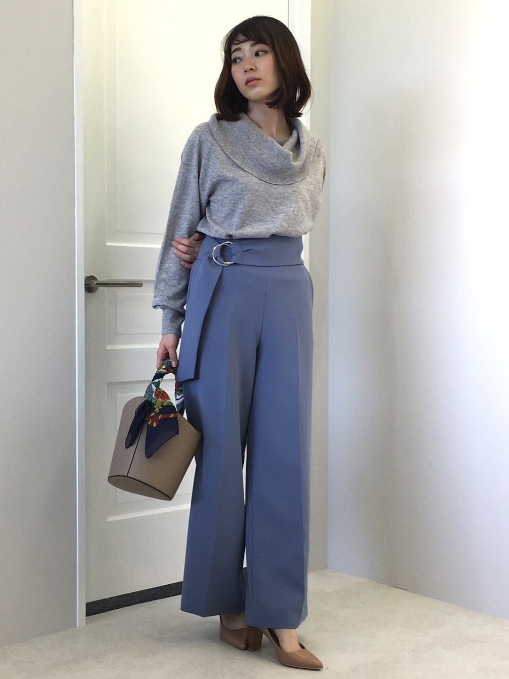 トップスはオフタートルとして、またはオフショルダーとしても着用の変化を楽しめるニットで ハイウェストパンツとの相性抜群です。