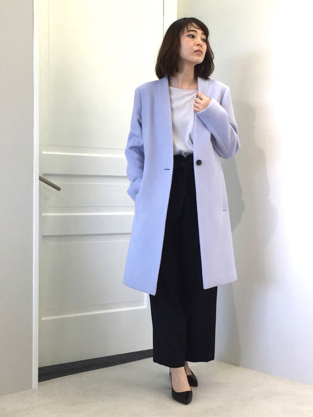 カラーコート人気の今秋冬は断然優しいカラーのスタイリングが一押し! シンプルなインナーでもスッキリ開いたフロントで軽い着心地のウールコートはこの季節万能。
