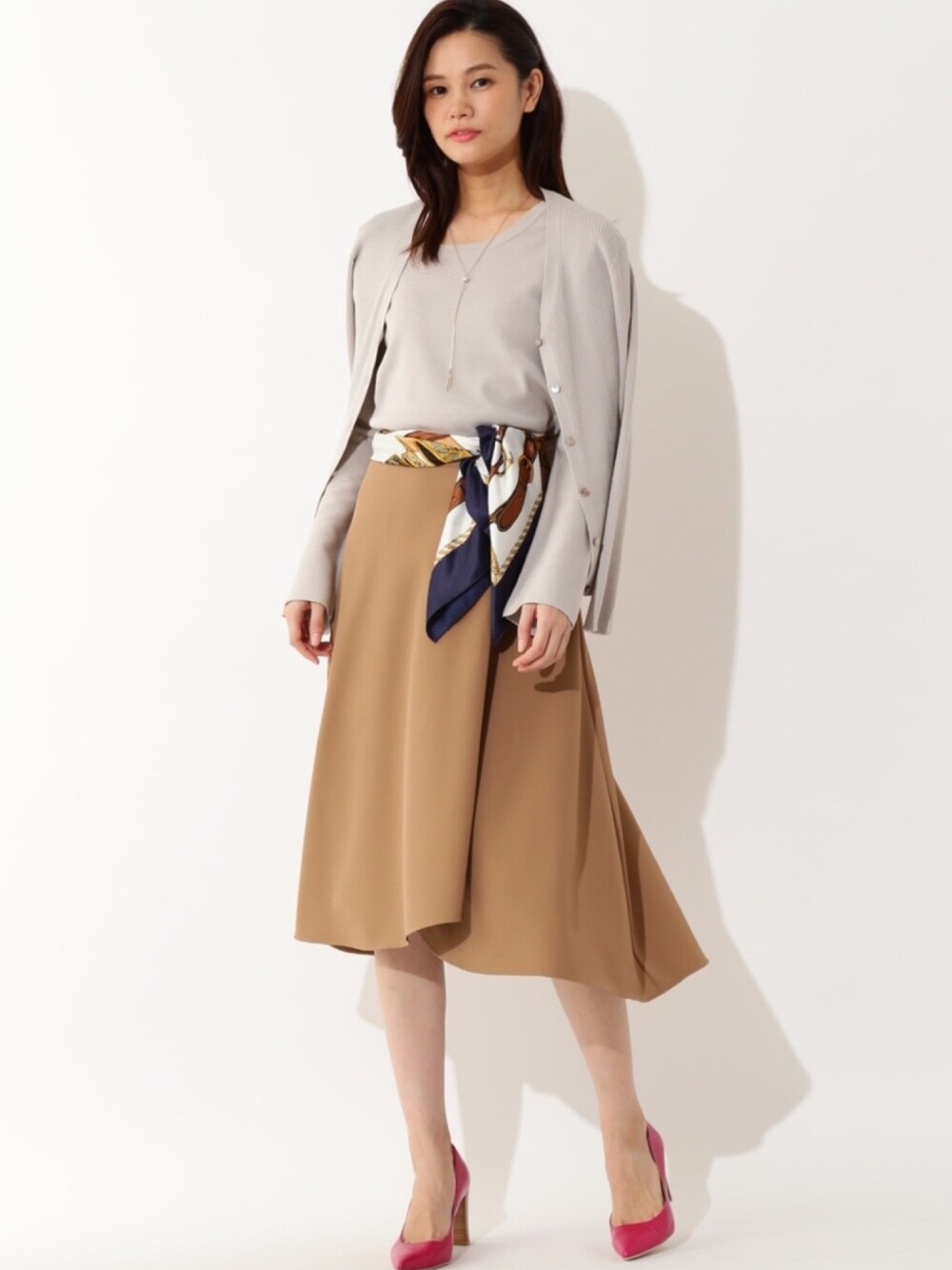 アンサンブルにフレアスカートのベーシックなコーデもスカーフアレンジでこなれた感じに。