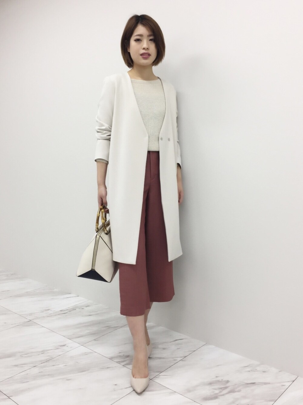 ベージュ×ピンクで春らしくお仕事スタイルをアップデート! Vカラーのコートでスマートですっきりとシャープな印象に。