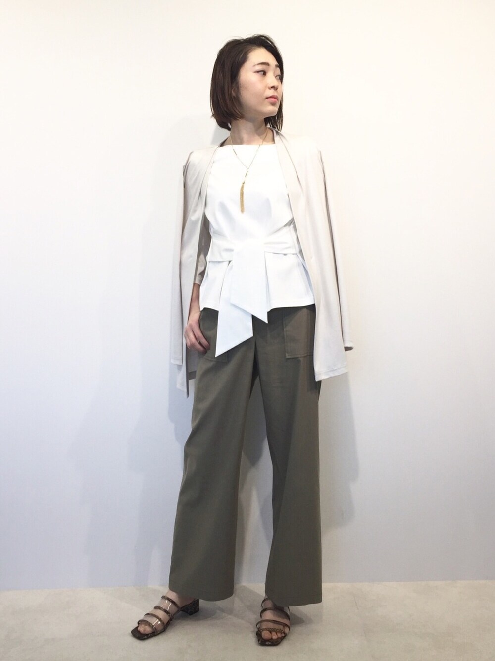 カジュアルな印象になりがちなベイカーパンツには、ウエストをマークした女性らしいカットソー&シーズンを通して使える長め羽織を合わせれば大人シックな装いに。