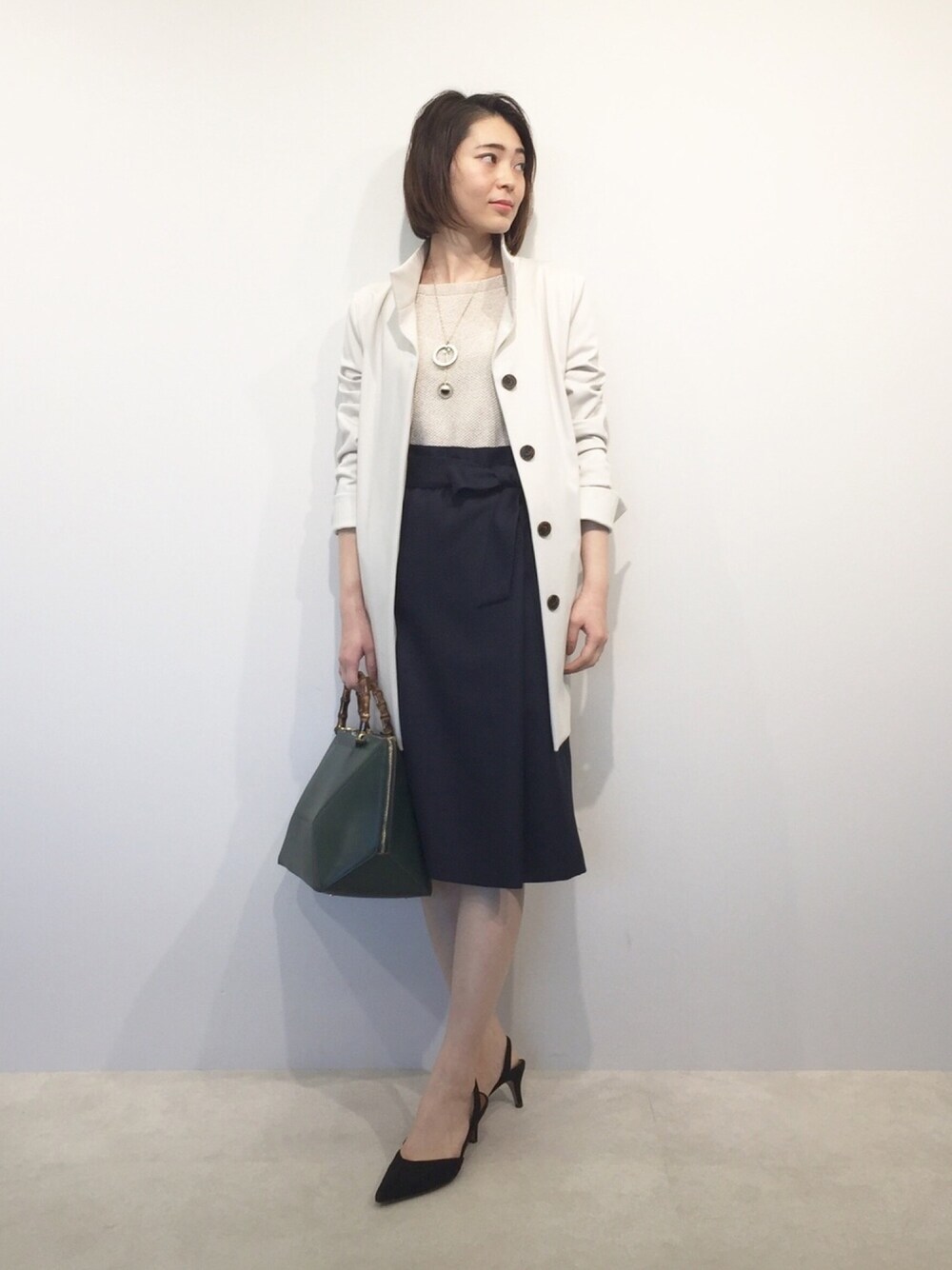 ベージュ×ネイビーの王道コーデ。ベーシックなどスタンドコートには膝下丈のレディな印象のスカートを合わせて大人っぽく。