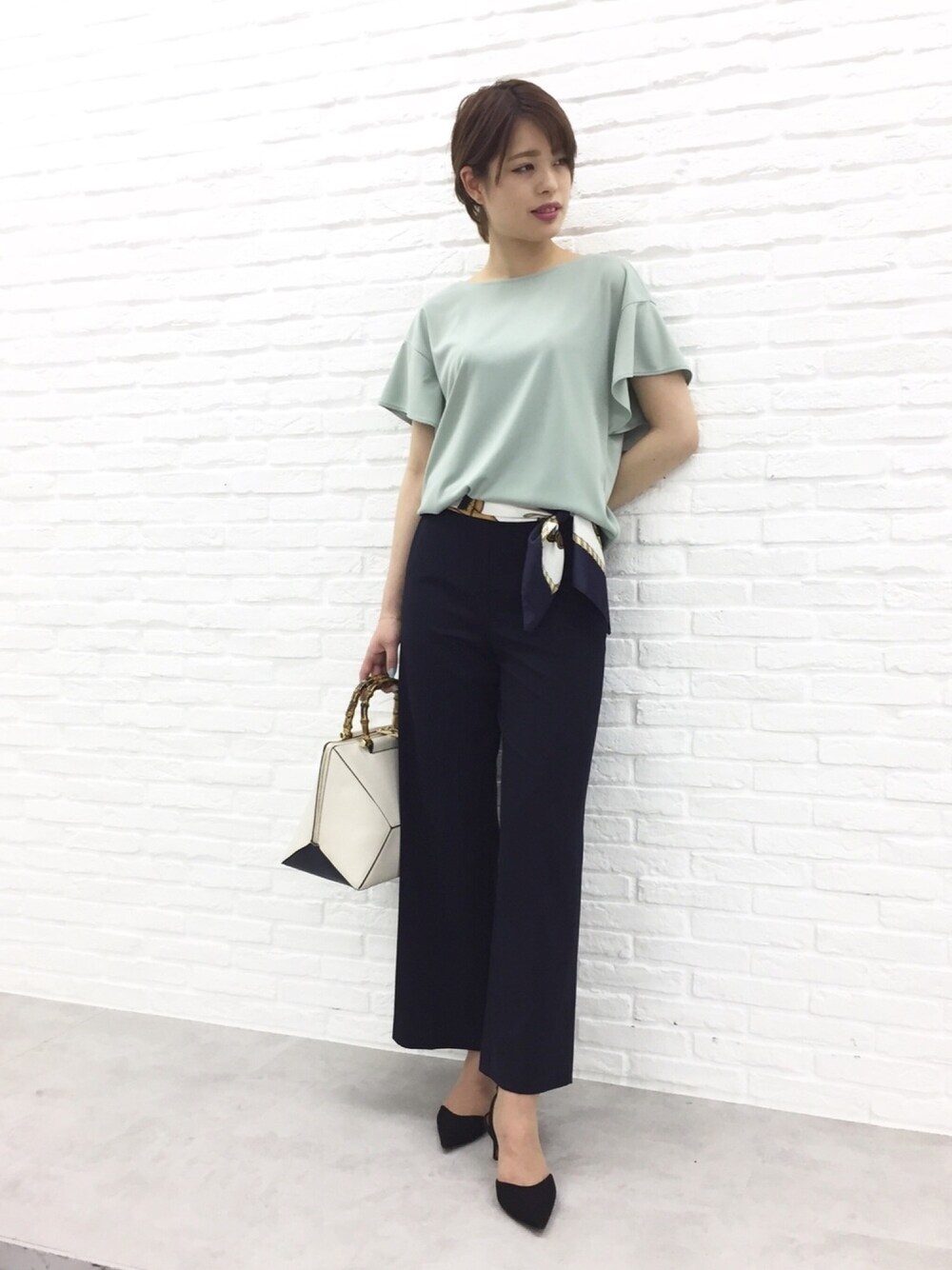 グリーンのカットソーは爽やかなライトカラー。 フレア袖が1枚でも華やかな印象を与えてくれます。 ネイビーのワイドパンツにスカーフベルトを巻けば遊び心あるスタイルに。