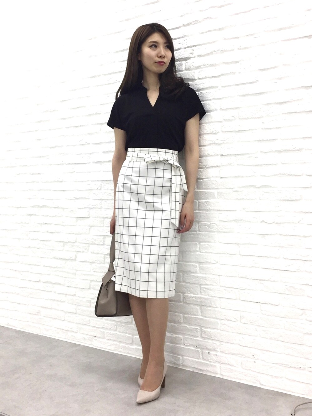 爽やかな印象のウィンドペンチェックのスカートて夏の通勤コーデ。