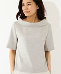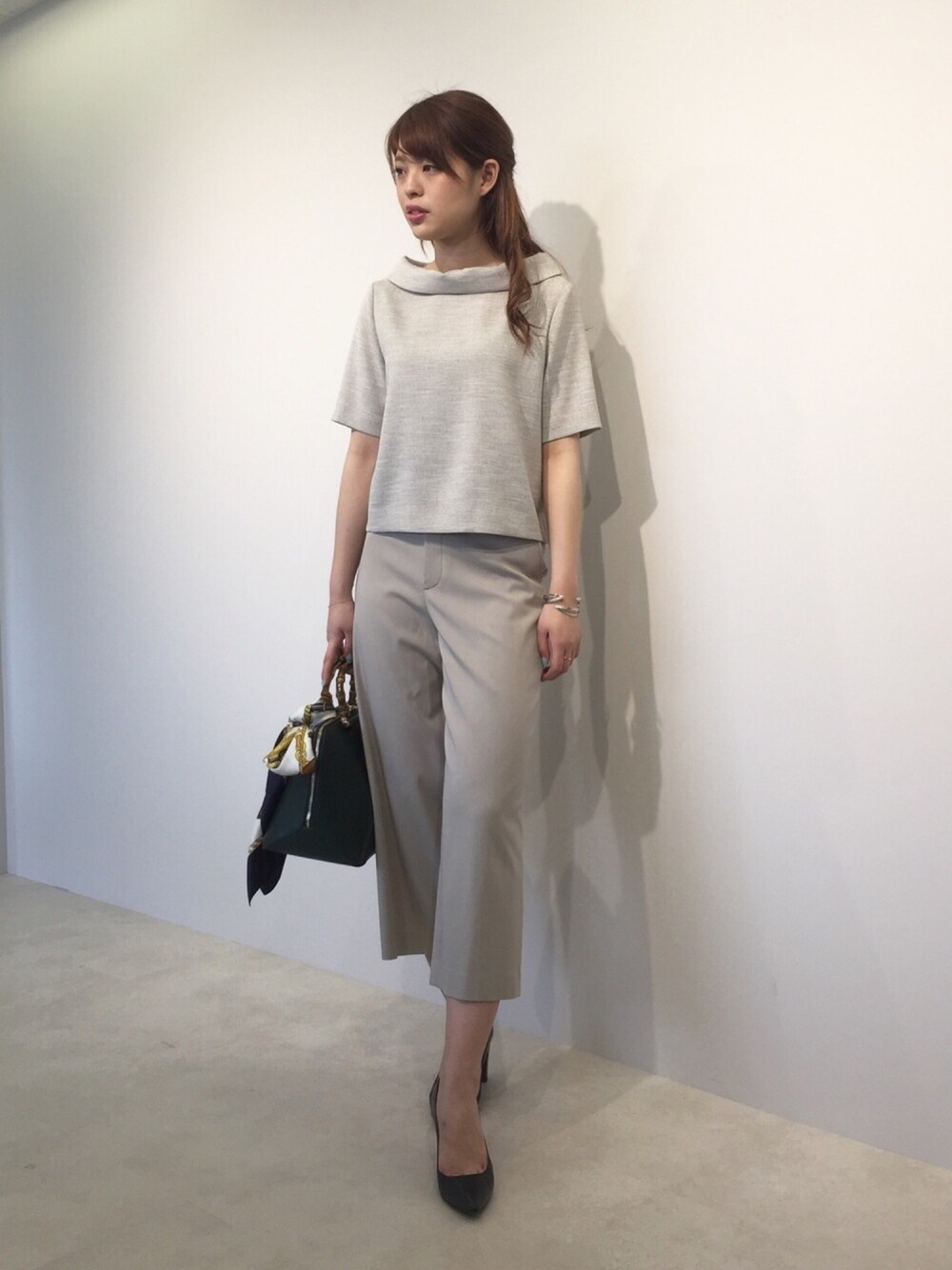 ライトグレー×ライトベージュのワントーンコーディネイト。 ブラウスのロールネックがポイントになり、キレイめすぎない力の抜けた着こなしに。 小物の色を深くすれば全体が締まります。