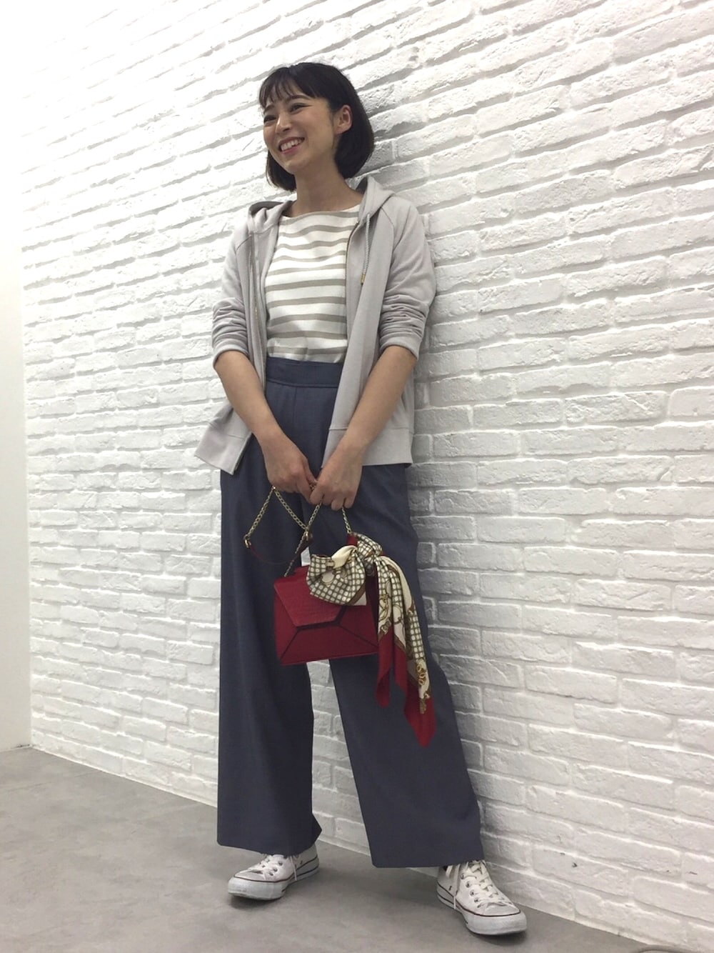 大人のパーカースタイルはきれい目素材のパンツとあわせてこなれ感を。デニムライクなワイドパンツにリュクスなミニマルバッグを。