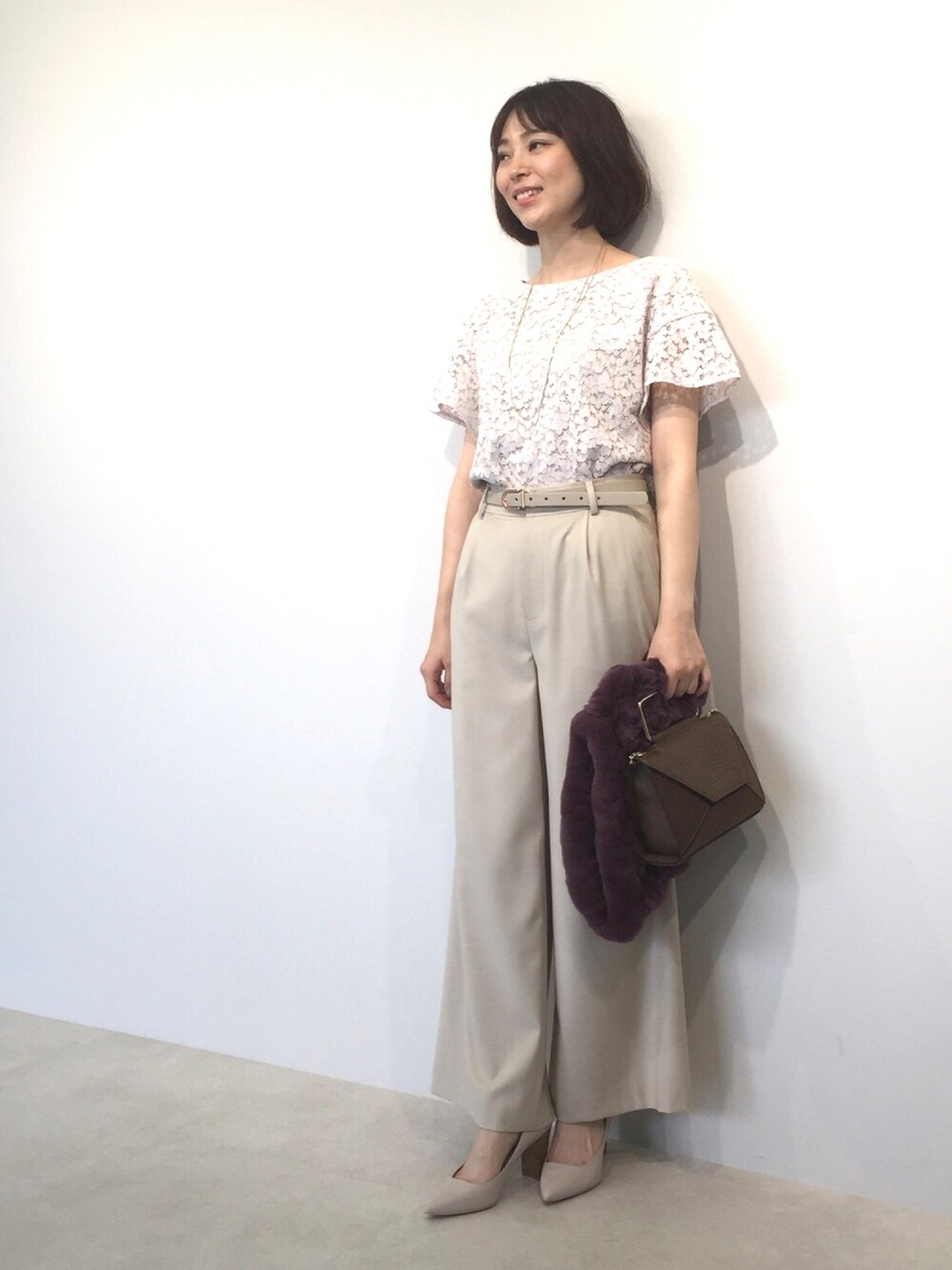 ワイドパンツにフェミニンなレーストップスを合わせてワントーンコーデ。甘すぎない大人っぽさを演出。