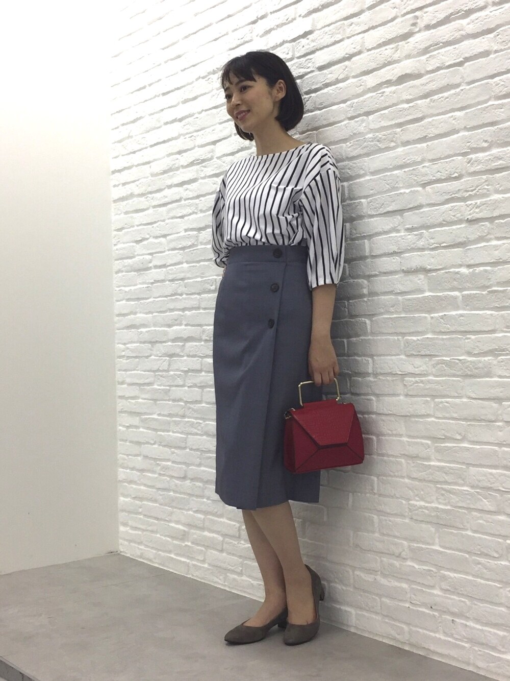 ボリュームスリーブのブラウスもストライプなら甘すぎない。デニム調のタイトスカートでキレイめコーデ。