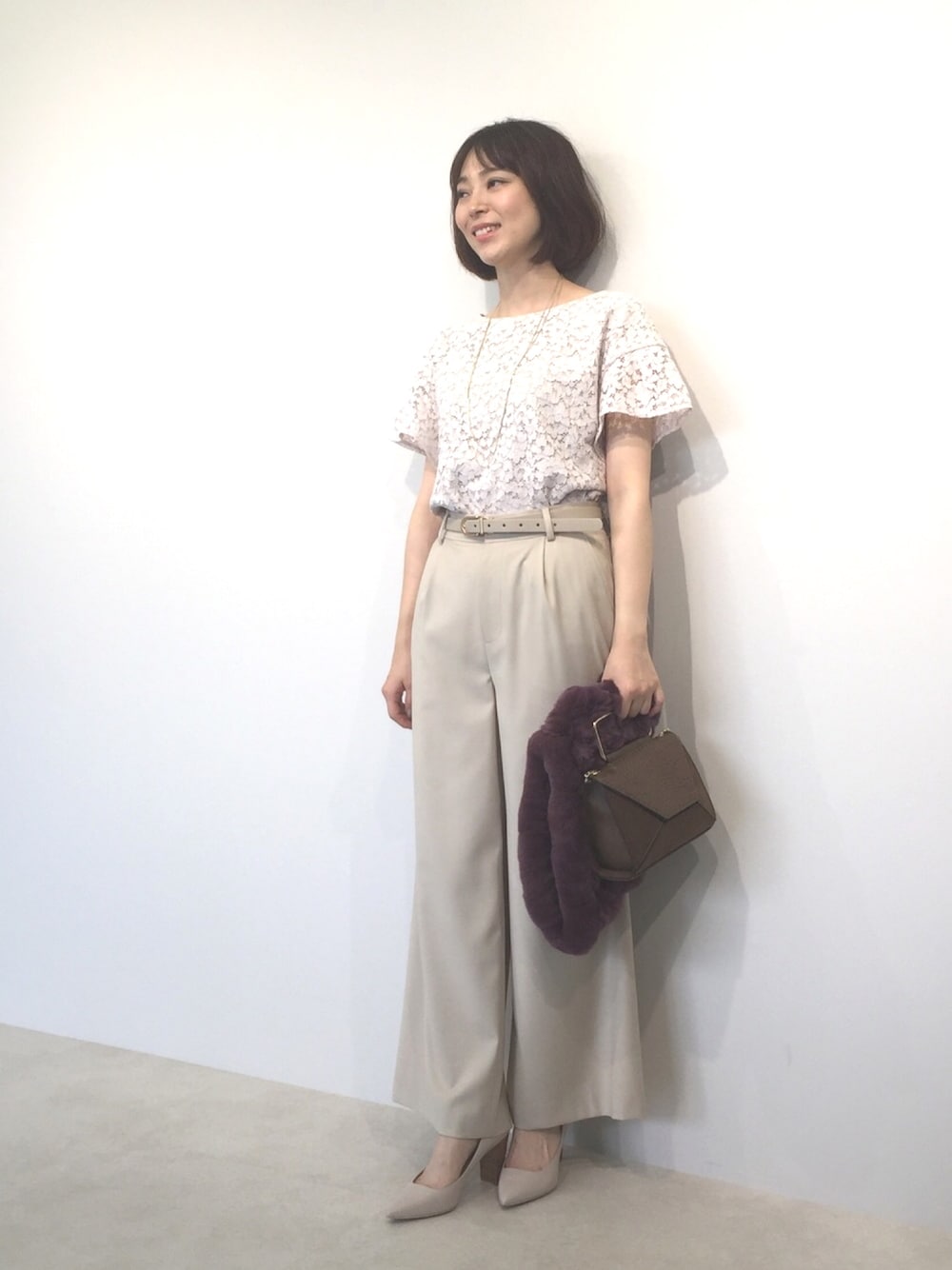 ちょっとしたお呼ばればれにはレーストップスがベスト。きれい目のワイドパンツにファー&ミニマルなバッグでパーティスタイルに。