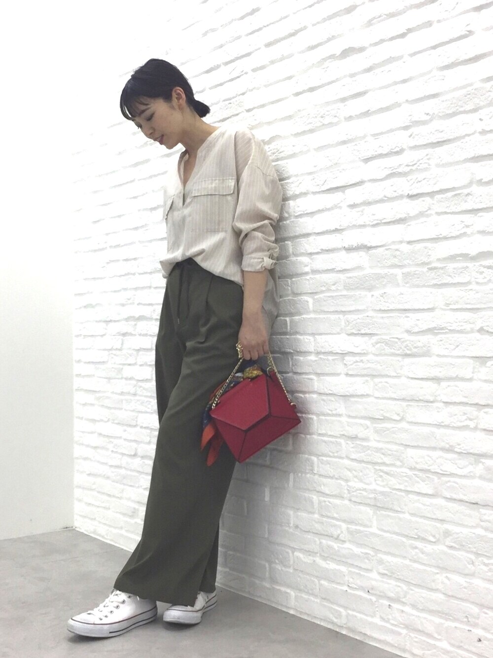 抜け感のある着こなしを完成してくれるストライプシャツにドロストのワイドパンツを合わせて。