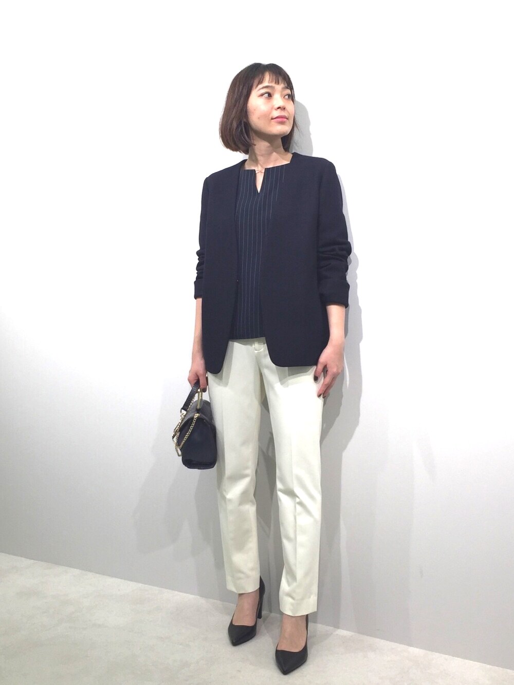 ネイビー×ホワイトのお仕事コーデ。マニッシュなカッコいい女性を演出してくれます。