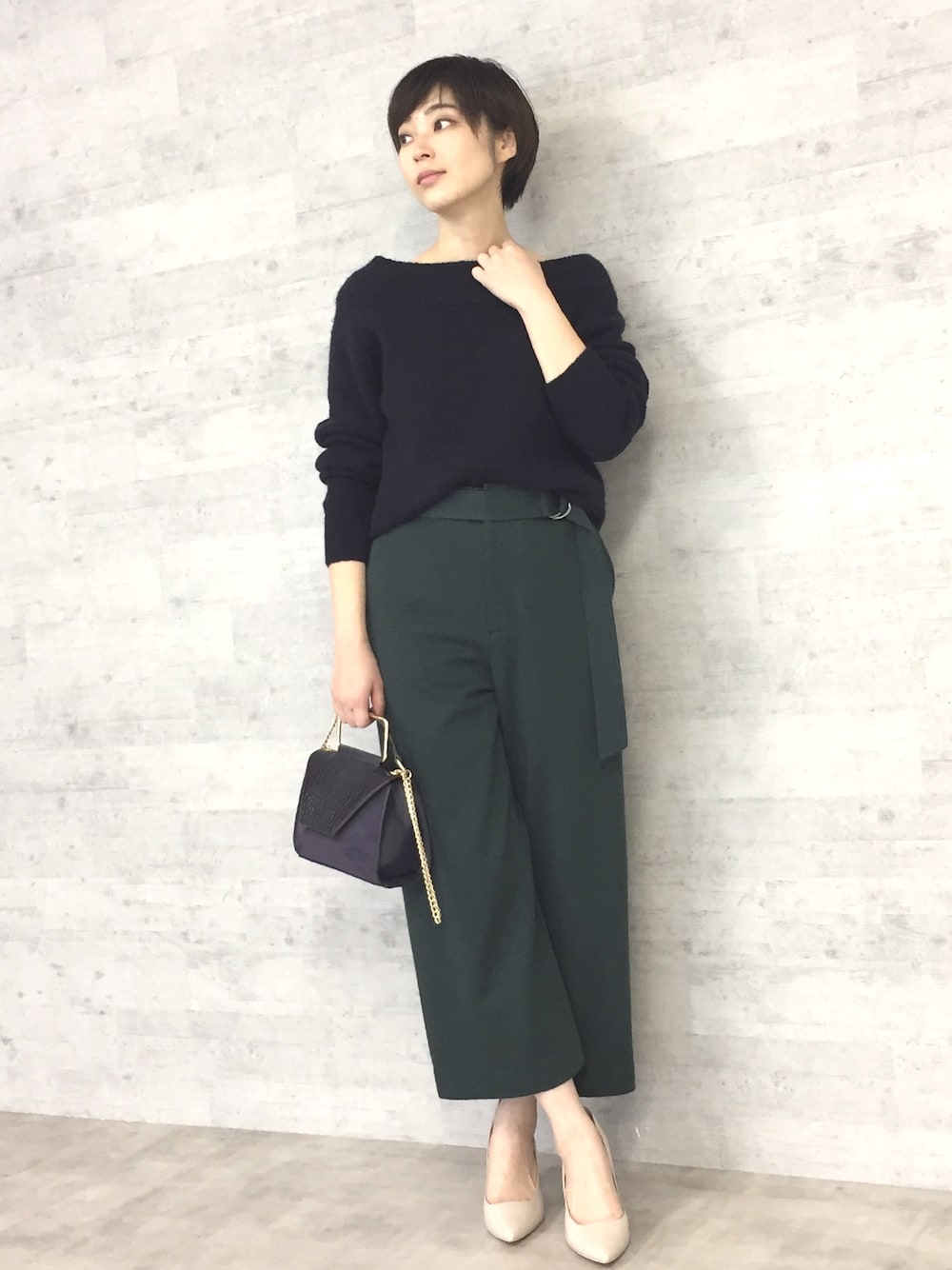 シックにネイビー×グリーンの大人コーデ。