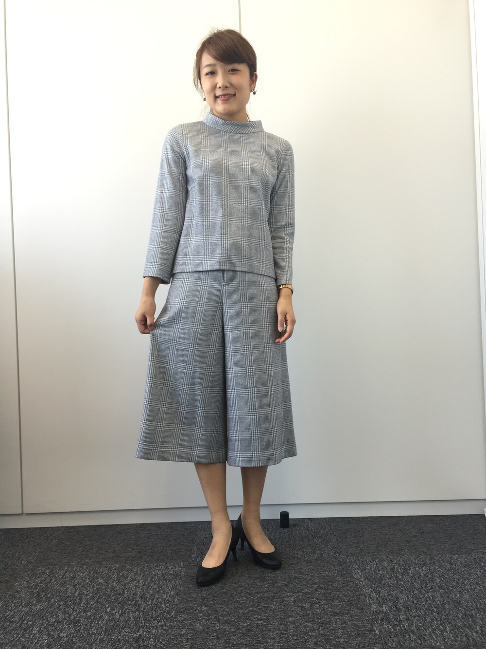 ガウチョパンツと同素材のブラウスとのセットアップコーデ! グレンチェックで今年らしく、またボトルネックの襟元がポイントのコーデ!