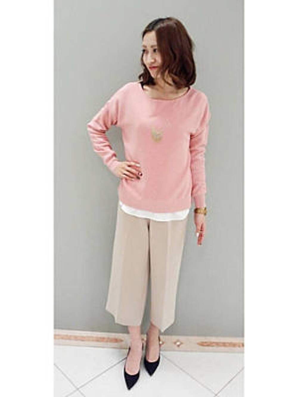 春らしいピンクカラーのニットにベージュのガウチョパンツで春コーデ。