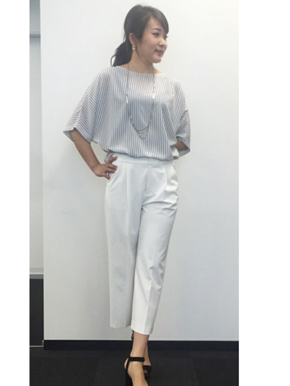 ドルマンスリーブのストライプトップスはホワイトコーデでお仕事にもおすすめ。