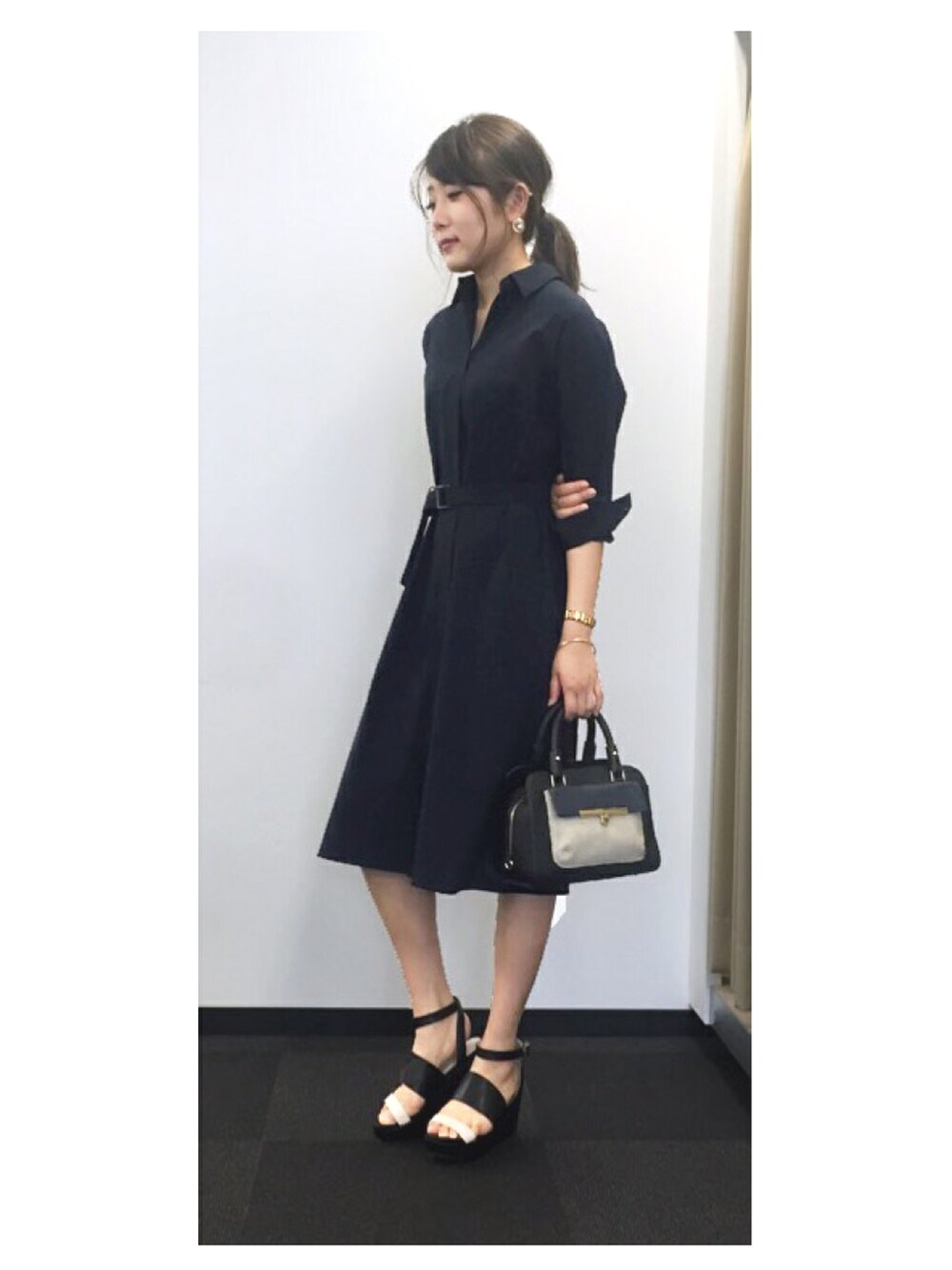 大人なシャツワンピコーデ。ミディアム丈がかっこ良くこなれ感を演出します。