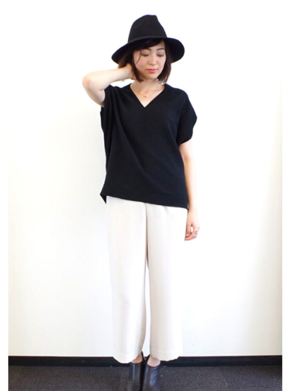 フォルム感のあるニットとガウチョパンツのリラックスコーデ。
