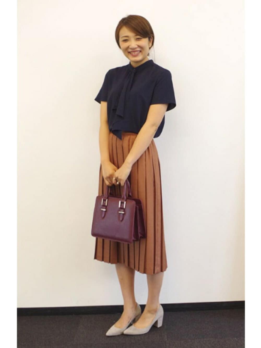 【ドラマ着用 】ネイビーとキャメルのコーデは今年らしくておすすめ!プリーツスカートとボウタイブラウスを合わせてクラシカルに