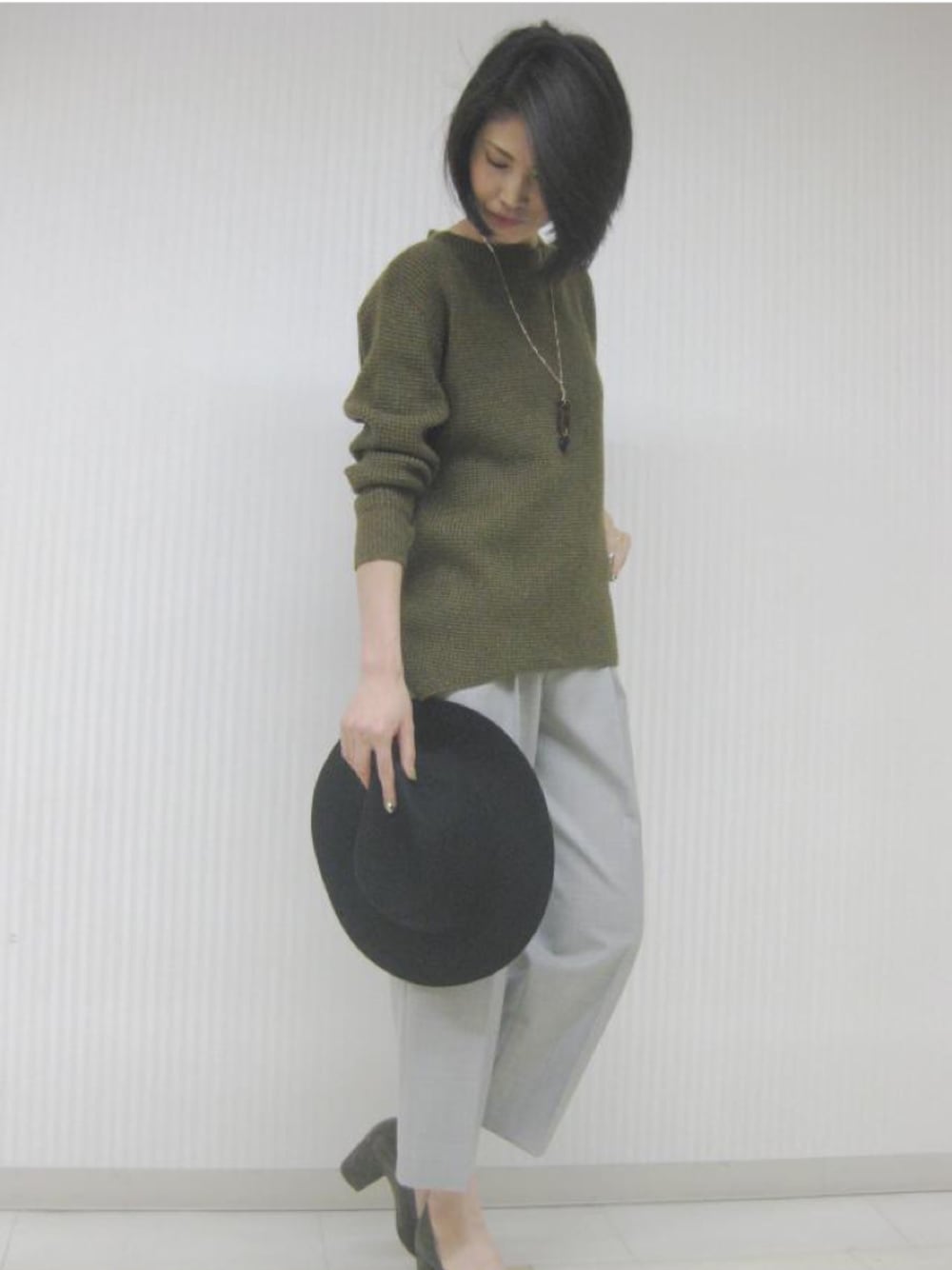 フォルムニットとタックパンツのシンプルコーデ。