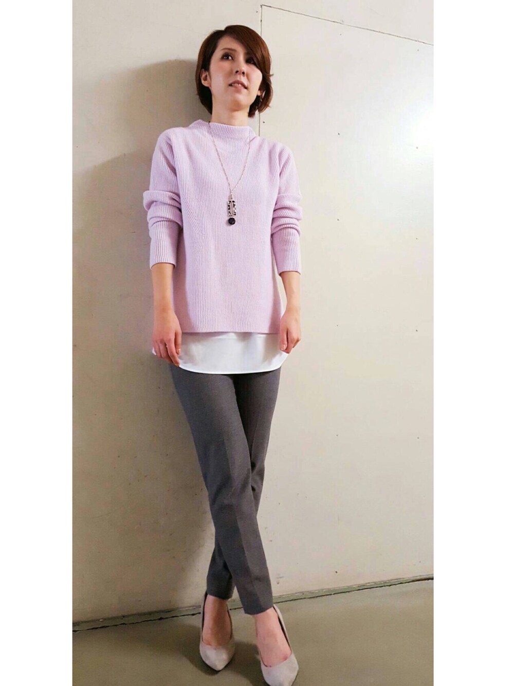 ウィンターパステルのツインニットにベーシックパンツでお仕事コーデ。