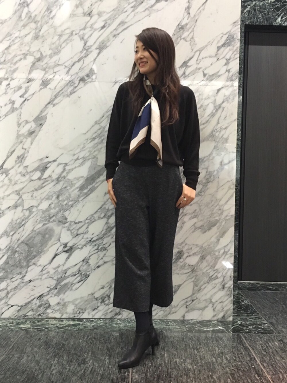 チョコレートカラーは今年のマストバイ!ドルマンスリーブのニットはシンプルだからスカーフアレンジで今年らしく。