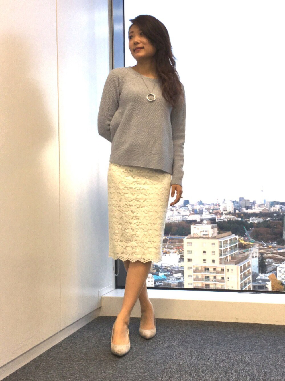 ホールガーメントのニットにレーススカートを合わせてエレ見えお仕事コーデ。