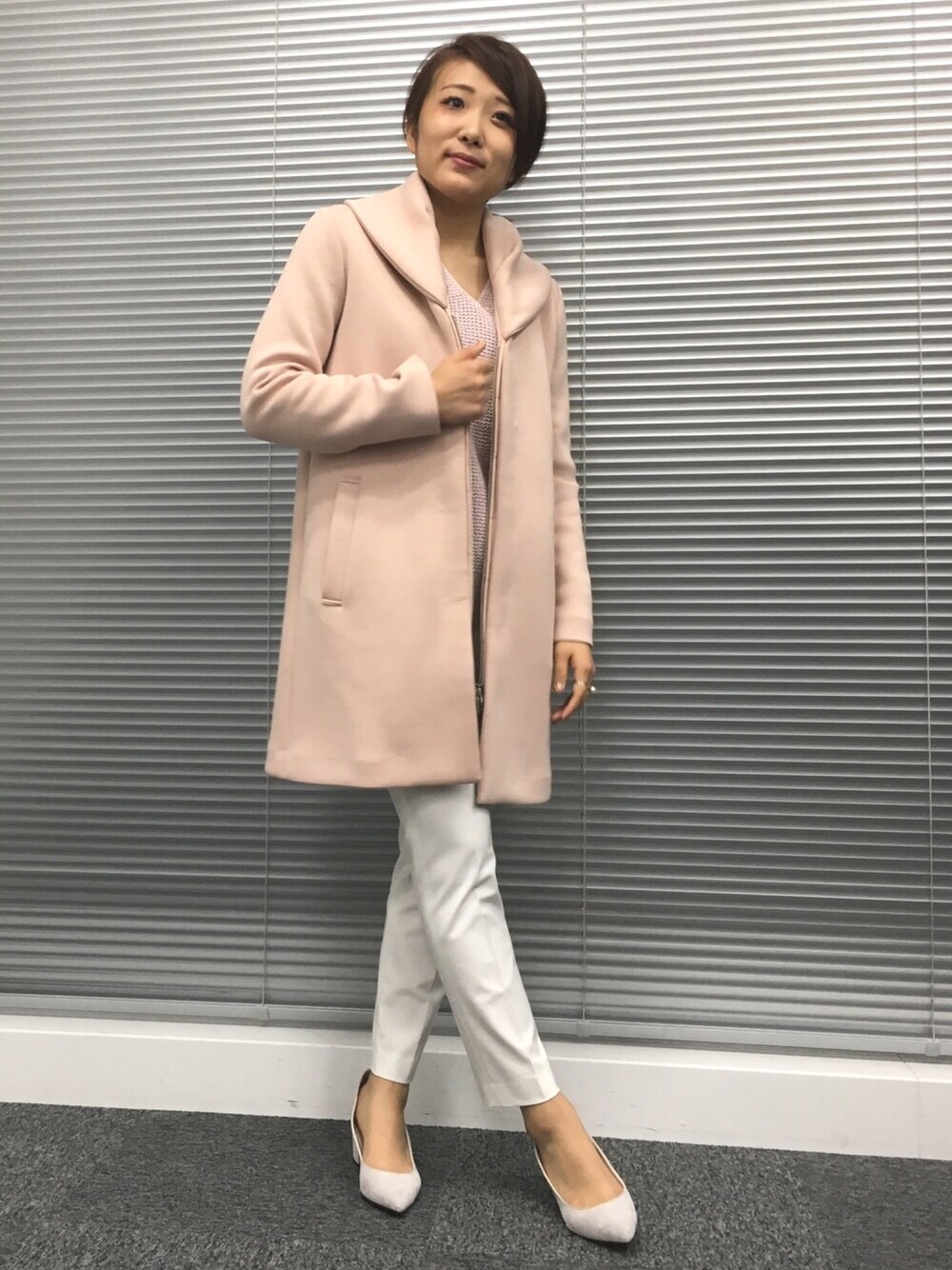 いまから着られる3wayボンディングコート。ピンクとホワイトでオトナなピンクコーデ。