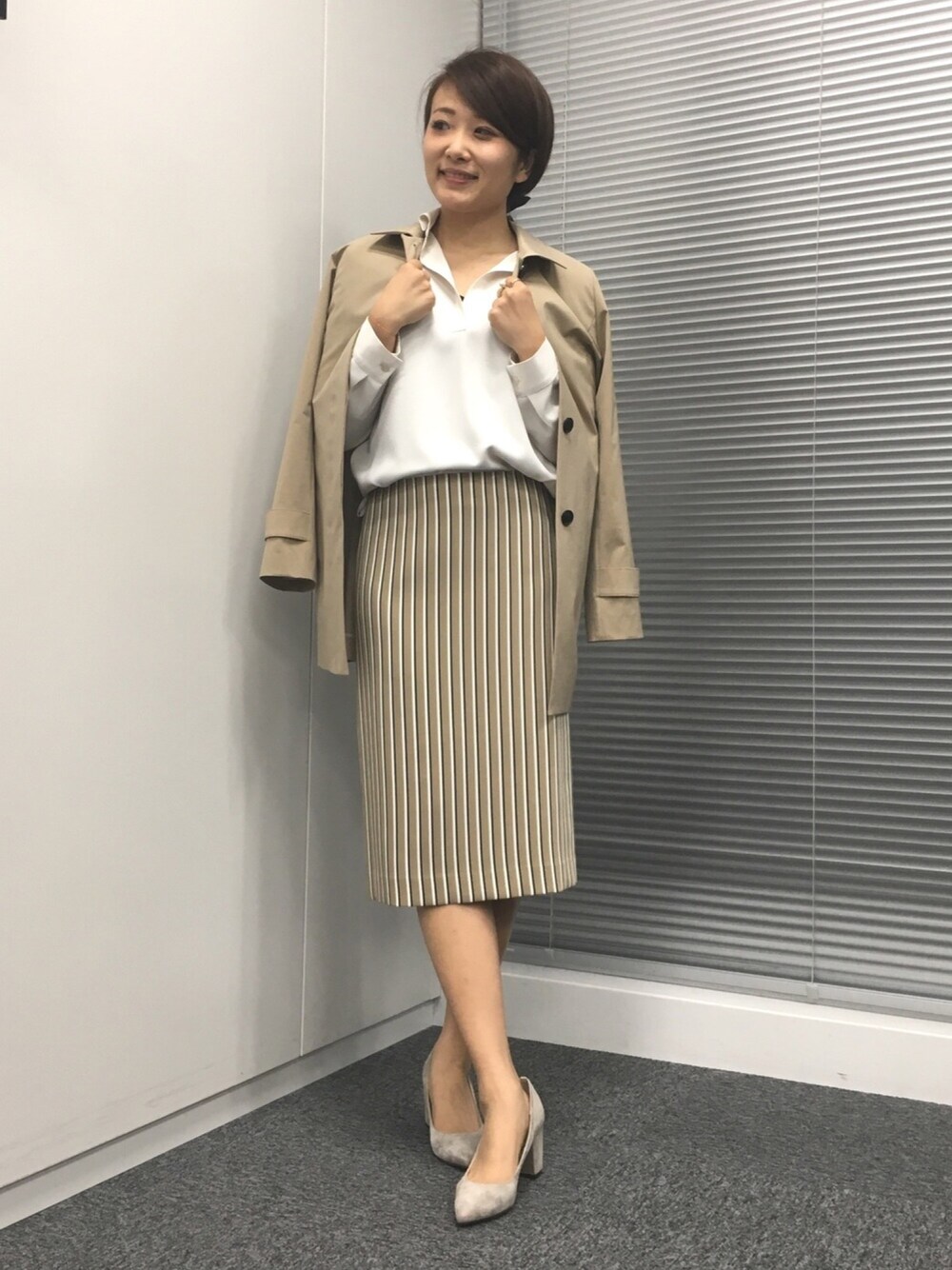 ホワイトとベージュのコーデにストライプをプラス!こなれ感のあるお仕事スタイルに。