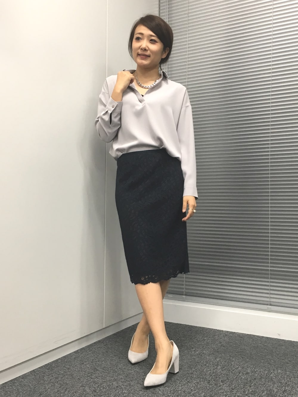 レーススカートととろみ系シャツを合わせて抜け感のあるお仕事コーディネート。