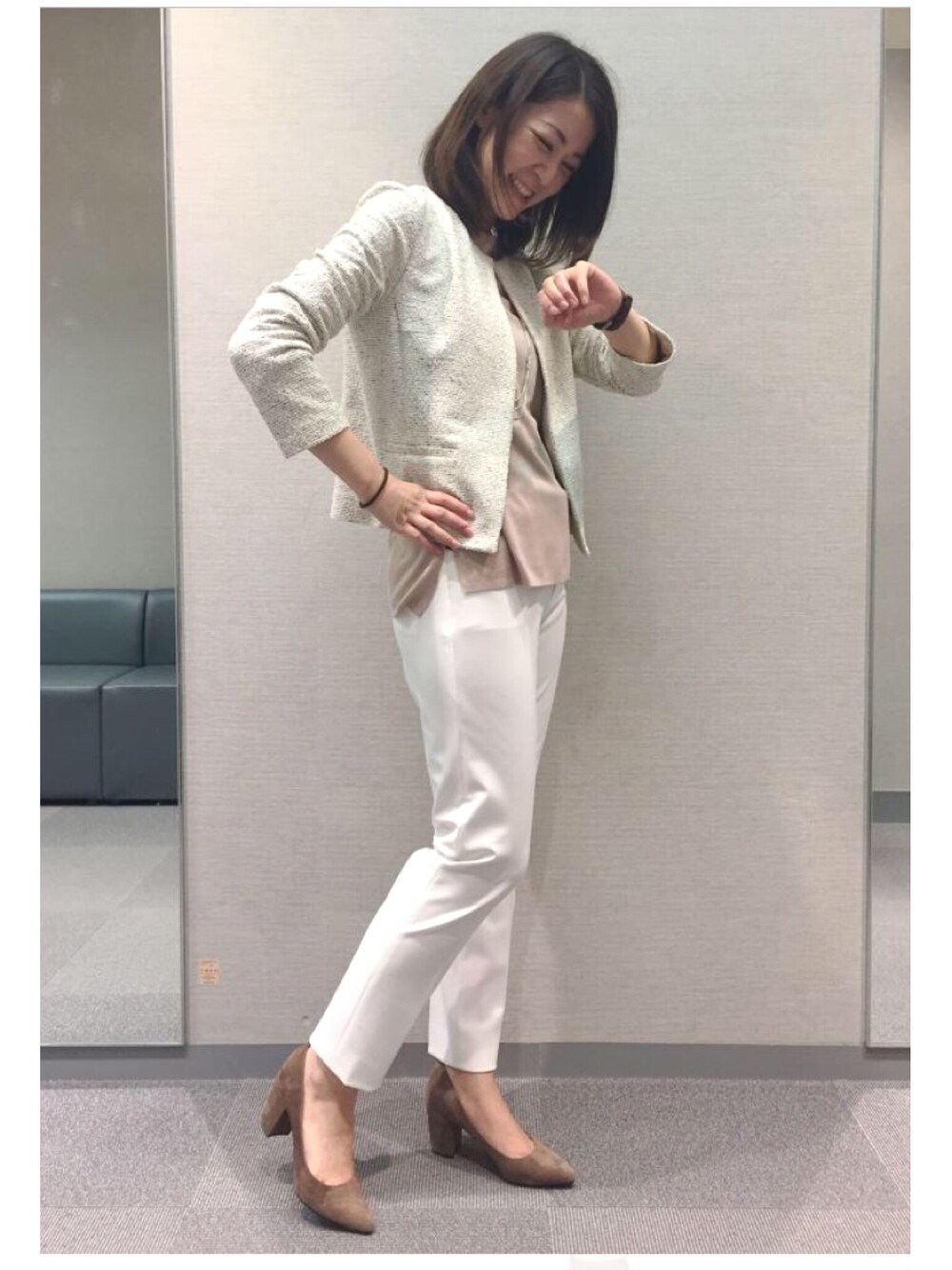 オフィスシーンで活躍するニットツイードジャケット。ホワイトコーデであわせて品良く。