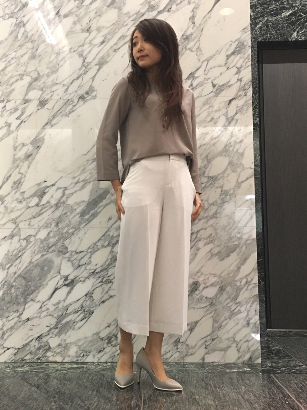 今年もとろみ系の素材はマストハブ。モカ×ホワイトでコンサバティブでこなれ感のあるコーディネート。