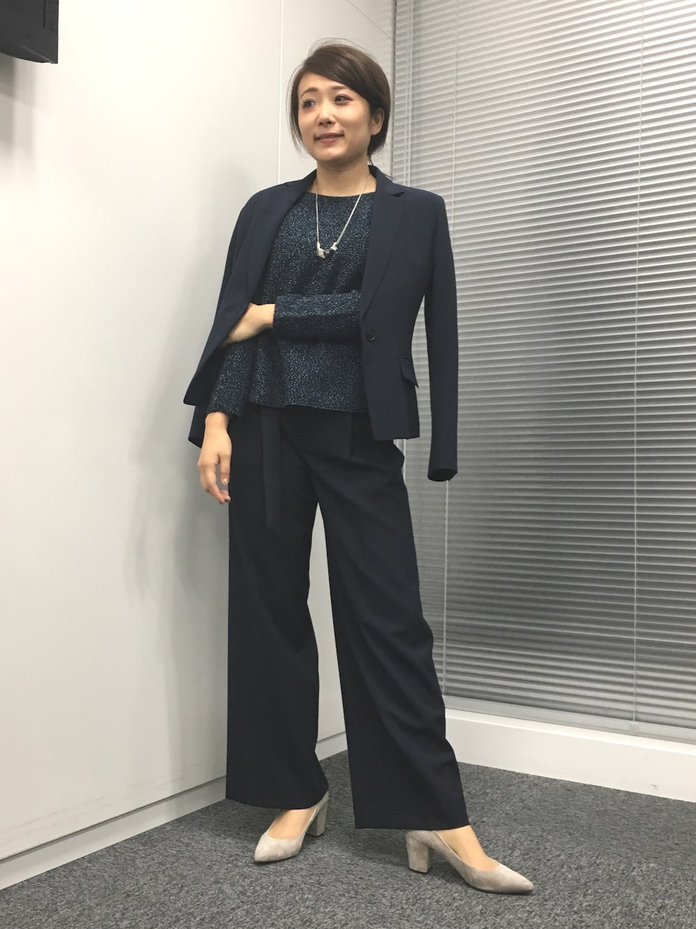ジャストウエストのワイドパンツでネイビーワントーンのお仕事コーデ。
